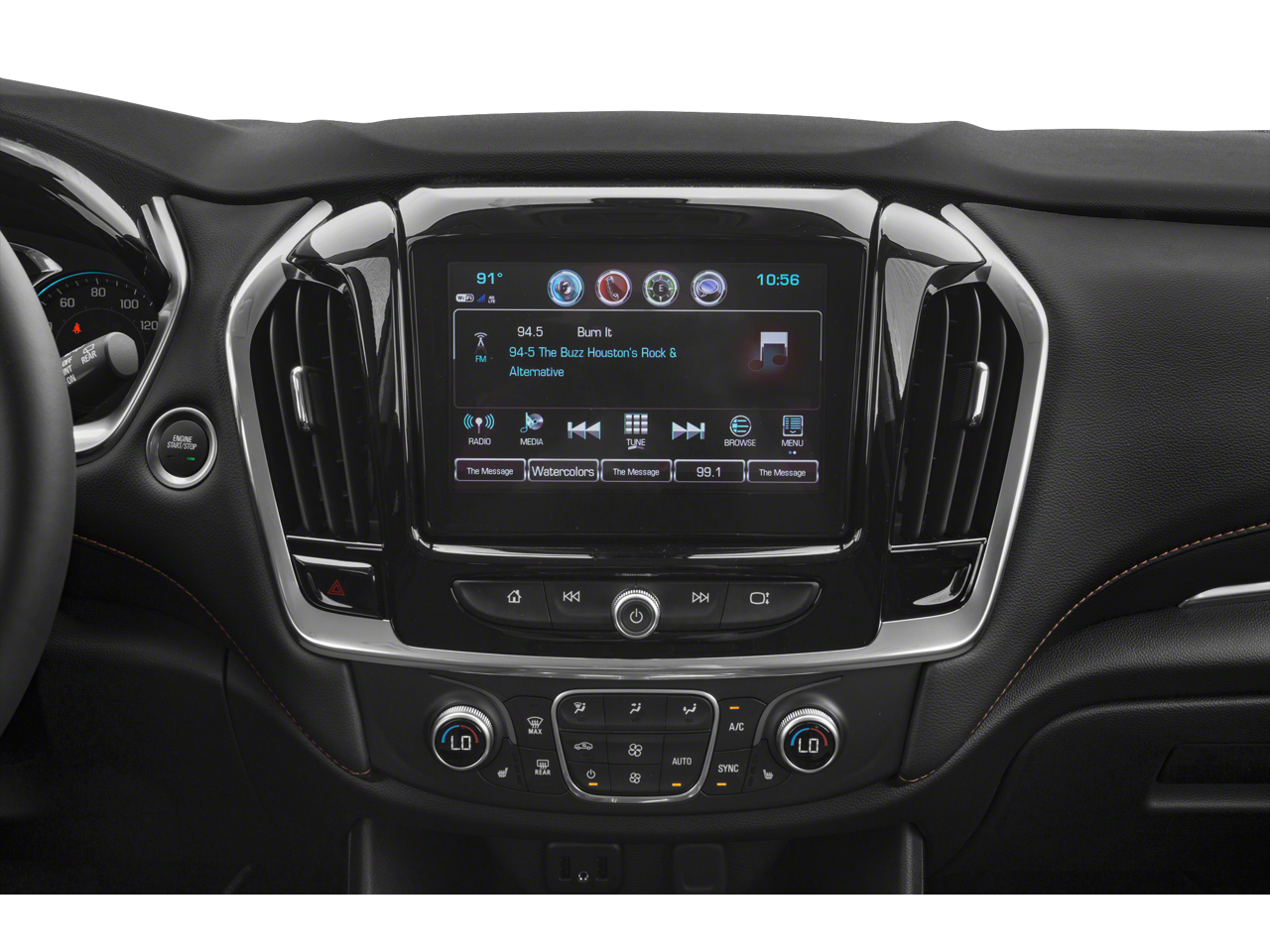 - Audio system, Chevrolet Infotainment 3 system 7" diagonal color touchscreen, AM/FM stereo. Additional features for compatible phones include: Bluetooth® audio streaming for 2 active devices, voice command pass-through to phone, Apple CarPlay and Android Auto capable (FWD only.)